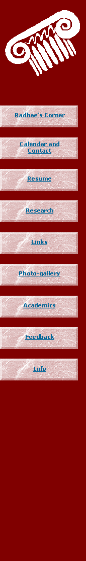 Radhae's Corner | Calendar and Contact | Resume | Research | Links | Photo-gallery | Academics | Feedback | Info